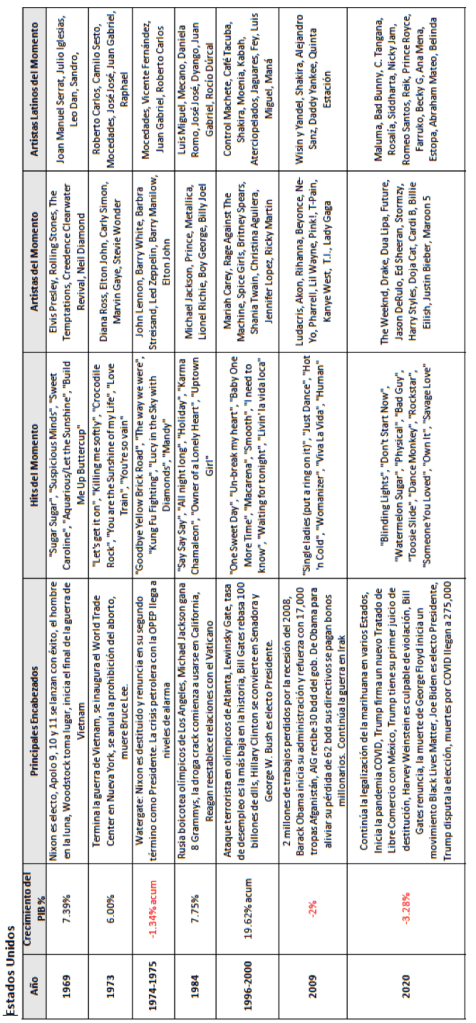 En la tabla 1.1 se puede ver una relación de los eventos principales en encabezados de noticias en Estados Unidos durante los años que más cambio en el PIB se ha registrado en los últimos 53 años, ya sea en caída o en crecimiento. Asimismo, se pueden apreciar los principales éxitos (mensajes) y los artistas de mayor influencia (portavoces). En este último respecto se agregan sus contrapartes en el mercado latino en español. No es raro que los cantantes que predominan en los momentos históricos de crisis muestren poco interés por la situación económica del país y que sobre todo en géneros como el Hip Hop y el R&B, la disparidad social se refleja en mensajes que guían a los menos favorecidos hacia un estilo de vida menos convencional e incluso de riesgos. Estos géneros se originaron en los mismos años que la desigualdad social se hizo más obvia y generalizada en los Estados Unidos. De esta forma, es interesante cómo de pronto aparecen ciertos movimientos que vale la pena resaltar: la predominancia negra en la música y luego la latina, el surgimiento del gangsta rap; en los últimos años aparece la figura de la Bad Bitch (e.g. Doja Cat, Cardi B) y también la inserción de los artistas auto-fabricados con su propio equipo de marketers expertos para diseñar su imagen, presencia y comunicación.