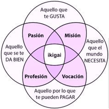 Este concepto japonés es crucial para una vida si no larga, feliz; me encanta. ¿Qué es el ikigai? Es el punto de actividad que cada uno elige como su razón de ser. En él se conjugan los factores que nos invitan a encontrar nuestra pasión, una actividad que nos permita fluir en alegría además de hacernos sentir útiles al mundo. Es lo que nos libera de ver al futuro como una amenaza, sino más bien pensarlo con entusiasmo sabiendo que será mejor sin importar cuán difícil sea el presente. El ikigai se encuentra en el epicentro de estas cuatro preguntas: ¿qué actividad te gustaría hacer por el resto de tu vida? (Pasión), ¿qué es lo que el mundo necesita de mí? (Misión), ¿para qué cosa tengo una facilidad? (Vocación), ¿a través de qué actividad puedo ser remunerado? (Profesión).