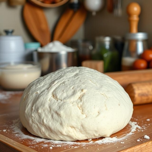 Aquí una imagen generada por IA. Se pidió así en el prompt: «Imagen realista de masa de pan en una repisa con diversos objetos de cocina como fondo.»